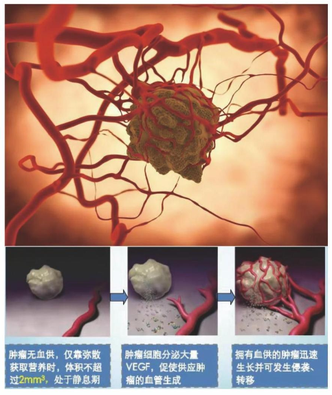 血管内皮生长因子(Vascularendo- thelial growthfactorVEGF)是一种具有高度生物活性的功能性糖蛋白。它是特异性的、生理作用强大的内皮细胞有丝分裂原,能作用干血管内皮细胞,使其增殖、迁移、管腔形成,参与血管生成并使毛细血管通透性增加:它可导致肿瘤血管异常生长,阻碍抗肿瘤药物有效输送至肿瘤组织内,并可刺激新生血管生长因子增加。